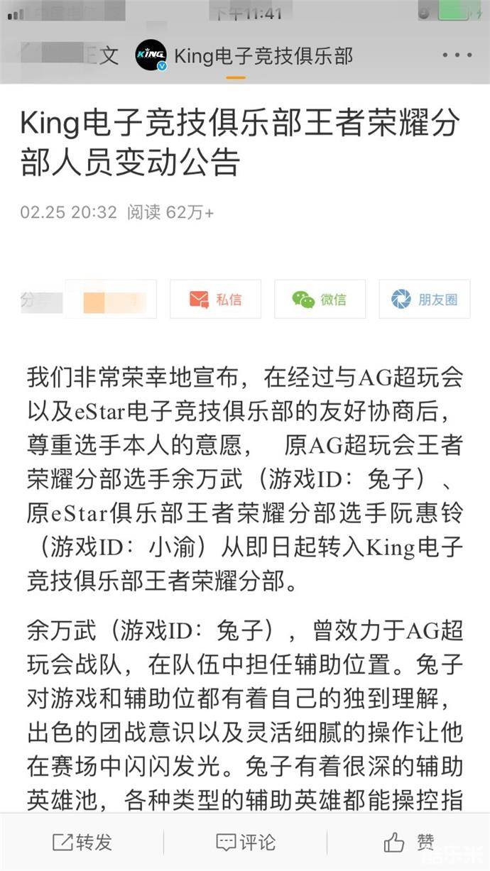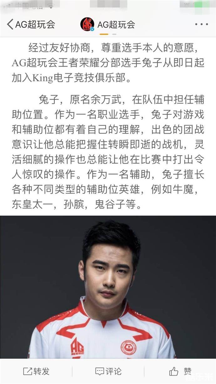AG超玩会发博送别兔子,赞美兔子是拥有着极高职业道德素养的电竞选手。