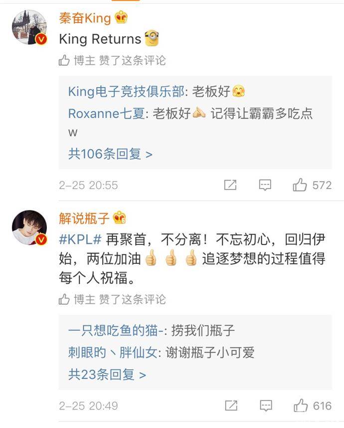 那么King俱乐部凭什么可以收拢两位KPL老将?在King电子竞技俱乐部官宣微博的评论中似乎可以发现答案,原来秦奋是King的老板。
