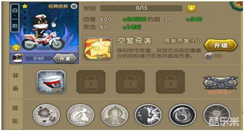 黑猫警长的潜能分别是:“连环爆炸”、“冲锋摩托”、“正义伙伴”、“战意爆发”还有“能量掌控”。“连环爆炸”需要英雄进阶到绿一阶即可开启,可以在释放技能时,有30%的几率触发多次伤害造成连环爆炸。“冲锋摩托”需要英雄进阶到蓝一阶即可开启,黑猫警长的摩托车在爆炸时对敌人全体造成0.1倍攻击力的真实伤害。“正义伙伴”需要英雄进阶到紫一阶即可开启,属于和任意娃娃的羁绊,可以增加自身的攻击力,并在对敌方造成暴击时,使敌方持续3秒的重伤效果。“战意爆发”需要英雄进阶到红一阶,属于永久增强生命值、攻击力、防御力等基础属性。“能量掌控”需要英雄进阶到橙一阶,会永久减少受到的伤害,并在能量满了后提高3%的攻击力并继续获取能量;在双倍能量时,可以提高100%的技能伤害。