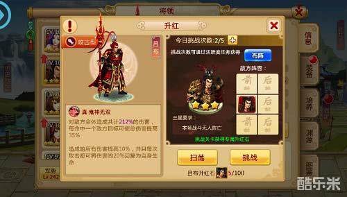 全新版本将开启武将觉醒系统,橙将满星生红,挑战至高战力!当橙色武将达到一定星级时,使用道具【升红石】即可升至红色最高品质,升红必备道具【升红石】通过挑战专属副本击杀BOSS获得。升为红色武将之后,原有的将领技能将会获得额外新效果,同时开启魂印系统,加强战力!