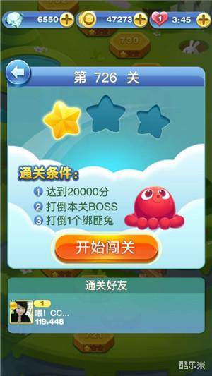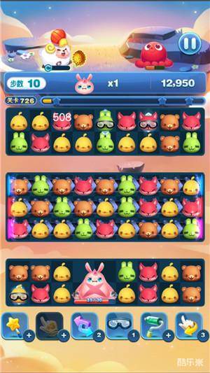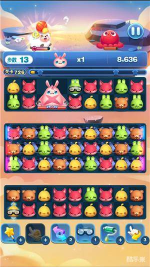 通过对图中的仔细观察我们可以发现在上方和下方这两个区域都是由两横排的棋子所构成的。一开始的时候这只绑匪兔是位于底部区域的,在它的左右两侧各有三到四个棋子,但是都是错列排开的没有办法消除,更没有办法来攻击它。所以我们要等待它移动到中间的位置,或者是上方的位置,再想办法来攻击它,它移动的规律分别是下方、中方和上方,这样三个步骤。我们每消除一次普通棋子也只能降低它一点战斗力,而且连这都是要靠运气的。所以我们一定要想办法在两侧的位置多制造出一点特殊道具出来。因为这只绑匪兔不管再怎么移动,它都不会移动到靠左或者是靠右的地方去,也只有这样我们制造出来的特殊道具才不会被绑匪兔攻击掉。