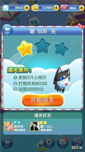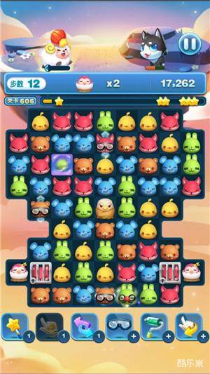 老鹰移下来以后,我们暂时先不要管它了。这时候就要去清除小鸡仔旁边的障碍了,这里的两个小鸡仔的旁边都各有一个被框架锁住的棋子,我们需要将其打破然后才能有机会将老鹰移过去。这里的框架都是双层的,需要经过棋子的两次消除才可以,一方面我们可以利用棋子自身消除的特性来帮助打破框架,另一方面,可以多多的制造出像目镜射线和旋风小丑这样的特殊道具来帮助打破,我的方法是将它们两个合在一起使用,这样便能在最短的时间内取得最大的效果,而且也更有利于我们获取三星通关。因为这里的棋子分布十分集中,有大把的机会可能获得这些道具,所以在这关中就应该把重点放在制造特殊道具上!