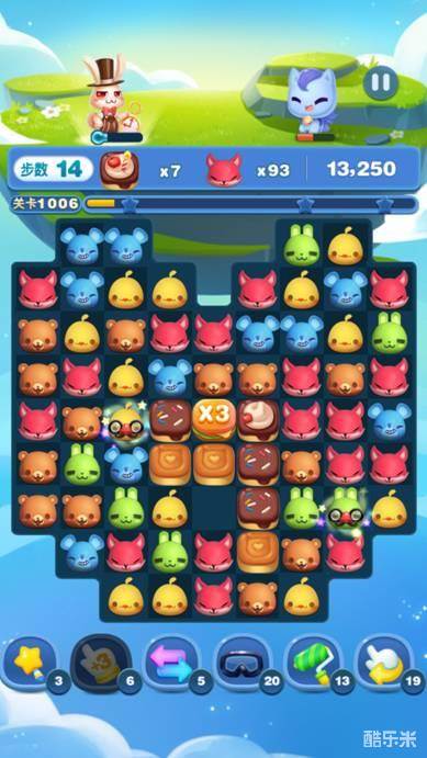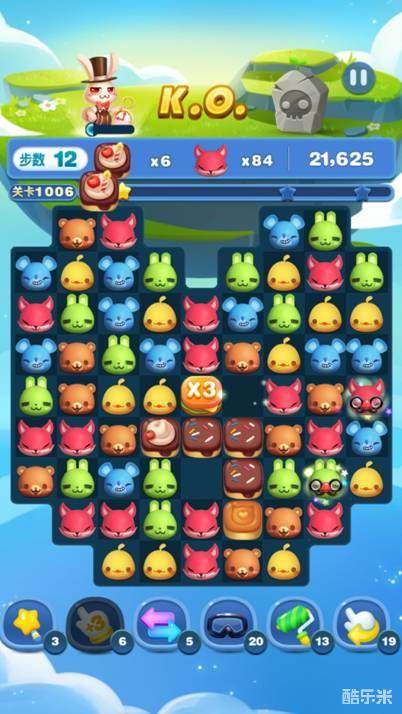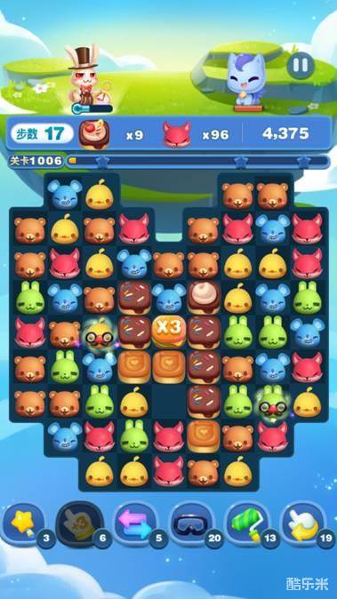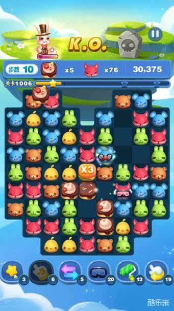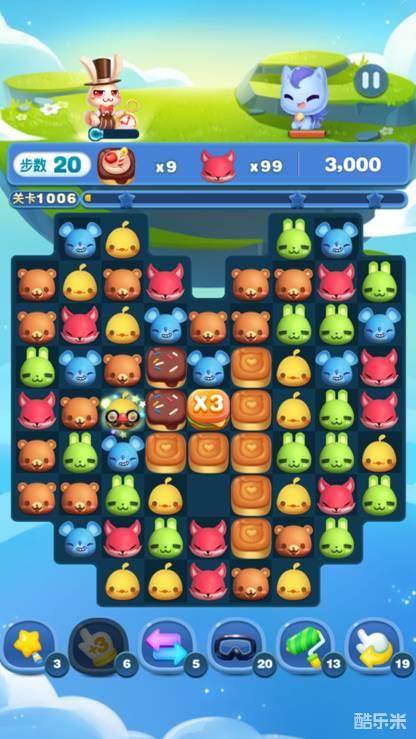 当认准一个面包之后,就开始围绕它进行消除。每一次消除就能够让面包“变身”一次,等各位玩家在面包周围消除四次的时候,蛋糕就做好了。这样再进行下一个蛋糕的合成,反反复复1006关需要的九个蛋糕就能够快速的完成啦。