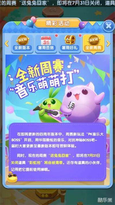 随着《天天爱消除》四周年新版上线,全新周赛“音乐萌萌打”正式与喵粉们见面了。在告别亲爱的小兔兔后,新一轮的周赛挑战又有什么独特的地方呢?下面一起来看看吧!(PS:通过50关的喵粉才能参加周赛哟!)