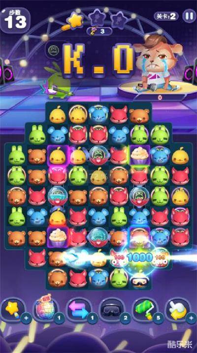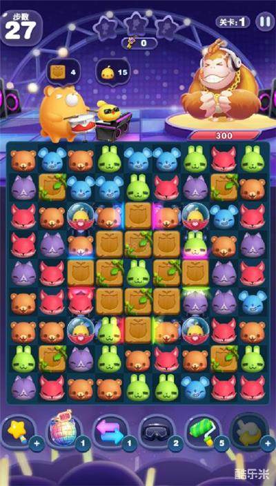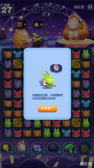 第一关的通关条件是将大猩猩给打败,但由于一般的消除并不能使宠物发动攻击,只有连击消除才能触发攻击,因此在第一关中就需要玩家们尽可能地进行连击,从而在规定步数内,打败大猩猩。此外,关卡中有一点需要注意,大猩猩发飙时会随机将小动物变成木格,缩小动物们的可动空间,建议喵粉们能使用&合成目镜射线或幽灵时,尽快操作。