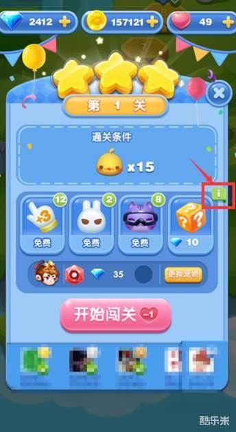 1、开始闯关界面,点击各式道具的右上角“i”按钮,可进入;
