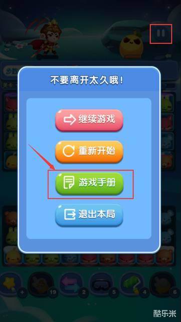 2、闯关界面,点击右上角暂定按钮,再点击“游戏手册”,可进入。