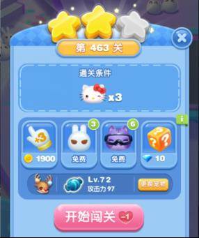 2、虽然每次开局kitty所在的位置会随机变化,但本关的冰块只有一层,可以直接看到kitty的位置。所以收集难度并不高,只要在下方区域匹配消除时,顺带消除kitty上方的冰块,拯救kitty即可。