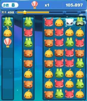 2、中间的一列区域,空间非常小,很容易就没有匹配消除的机会了。这时我们就要在右侧较大的区域进行匹配消除,来连取特殊棋子了。这里推荐连取横向的目镜射线,在消除汽泡的同时,还能消除热气球上方的棋子,让热气球随着水位上升。