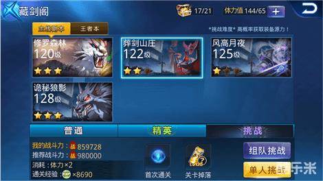 葬剑山庄的开启等级为122级,消耗2点体力,通关后奖励120级的装备碎片和8690点经验值,首次通关还能外获得强化石。葬剑山庄的推荐战力为98w,这个门槛可以算是非常高,所以小编建议大家达到门槛战力是再去挑战,当然也可以选择组队挑战或者使用援护好友功能,降低我们的通关难度。