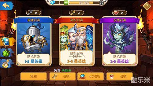 进入主界面的【英雄坛】,每48小时有一次免费的高级召唤,也可使用黄金钥匙。