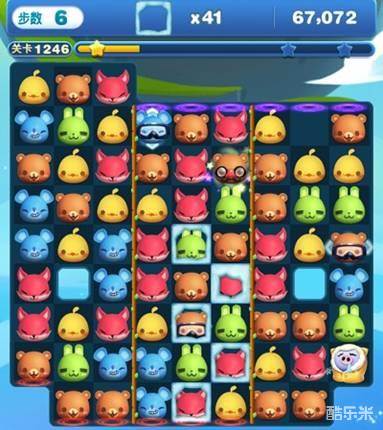 玩家想要消除爱斯基摩猪,就需要让爱斯基摩猪与同颜色的棋子进行匹配消除,消除方式与关卡中的棋子相同。除了匹配同色棋子消除之外,玩家还可以制作出特效棋子,或者是特效组合来进行消除。组合特效在关卡中释放,消除的范围比较大,比较适合大量爱斯基摩猪出现的关卡。