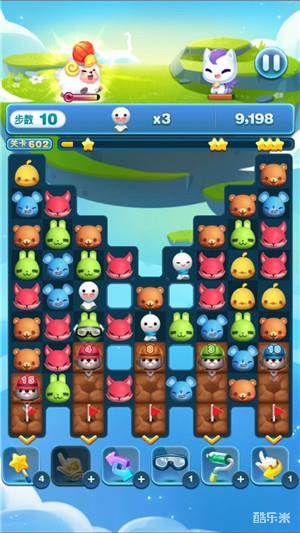 在整个图中底部的位置各有一个不同颜色的土拨鼠,需要消除15个同色的棋子才能将它们所在的路段铺设好。只要将这些路段铺好了,晴天娃娃就能顺利的掉落下来了。一开始的时候我们也没有什么捷径可以走;据我的经验只能是看到什么就消除什么,最好是消除娃娃旁边的棋子,如果娃娃旁边实在没有就消除其他位置一切可以消除的棋子。因为左边和右边三竖列的棋子相对来讲比较集中,所以我们在消除的时候注意制造几个像目镜射线这样的特殊道具,由于旋风小丑的制作至少需要5个集中的棋子,所以我们不必要花费步数去制造它了,唯一有可能的就是制造目镜射线!
