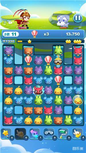 特效一直是棋子们最为有力的武器,虽然本关没有障碍需要消除,但是特效依然是最为有利的消除手段。当气球处于可下落区域时,一只竖目射眼镜即可完成这只热气球的收集,这也是收集过程中最为有效的收集方法。
