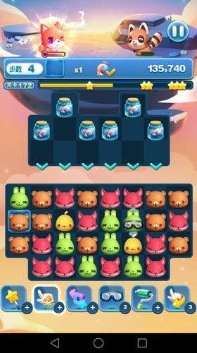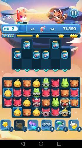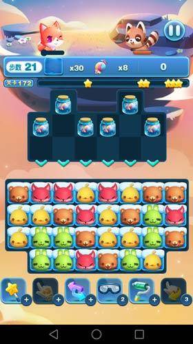图二就是172关的开局,可以看到,本关的地图相对比较特殊,糖果罐分布在地图的上部分,但是因为糖果罐下方没有任何阻挡,就直接是收集点,只要糖果掉下来就能直接被收集到,因此还是减少了一定的难度的。而本关的冰块都分布在下面的主体部分中,每个动物的下面都有一个冰块。我们需要做的就是在主体部分通过移动制造特殊消除,这个过程中不仅可以消除冰块而且可以打击糖果罐得到糖果。因此本关也是必须不断制造出特殊消除,才可能通关。