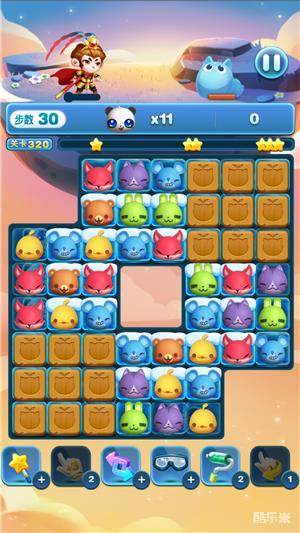 本关共有步数30步,玩家需要解救熊猫11只。关卡的布局看起来比较的简单,除了冰块障碍,其它就只有木块障碍了。虽然障碍的障碍的种类较少,对大家的消除造成不了多少阻碍,但是关卡的分布颇为复杂,再加上棋子的种类比较多,这都使得消除并不那么容易。