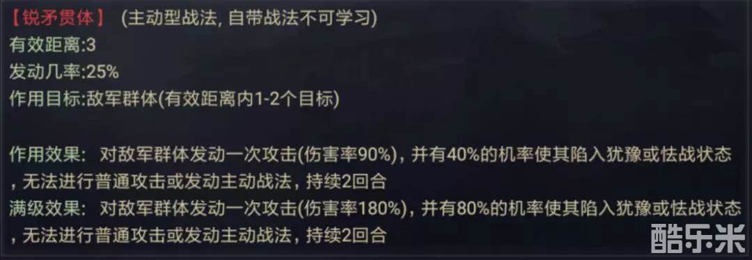 但是,25%的战法发动率,也限制了四星张飞的控制能力。除此之外,仔细研究【锐矛贯体】的技能描述,能够看出以下的信息:
