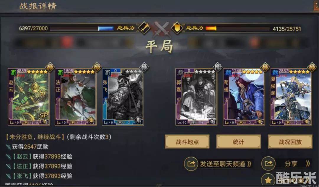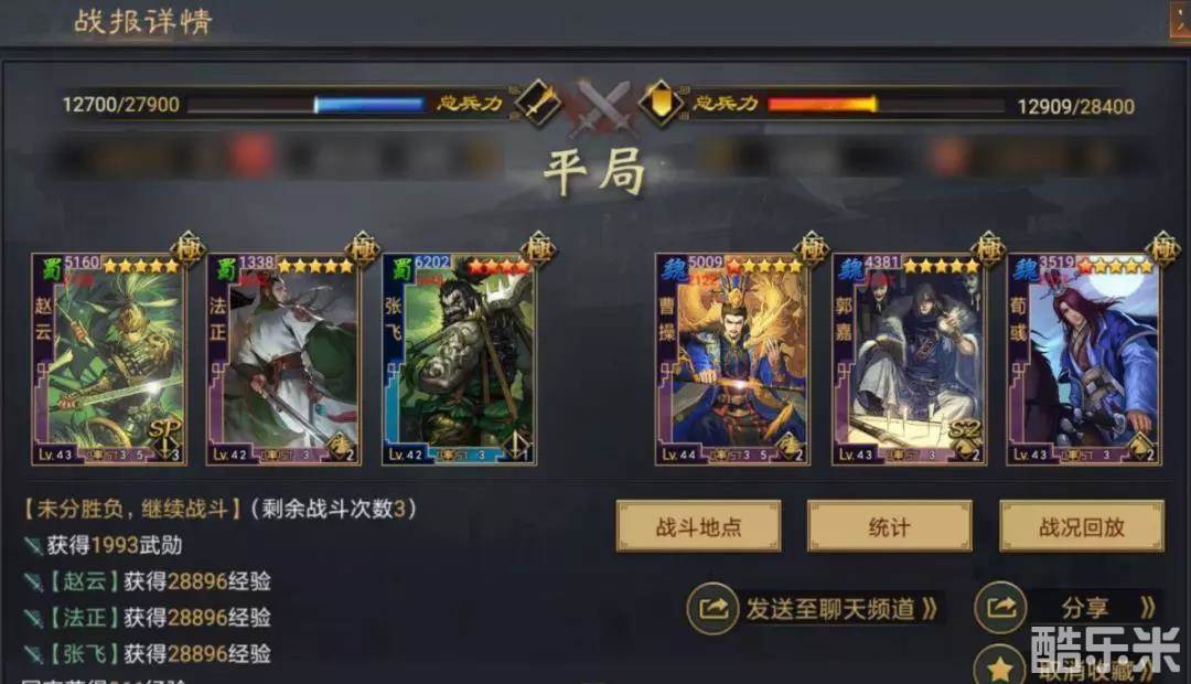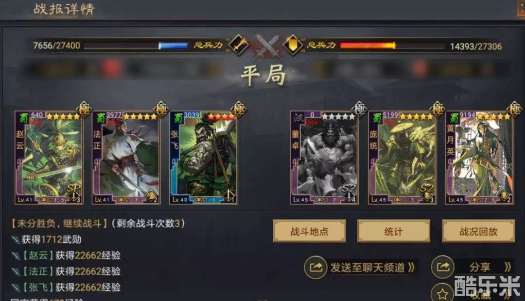 除去在面对肉系队伍稍显无力之外,整支队伍比较依赖四星张飞的发挥,【锐矛贯体】的发动次数对最终战果有着微妙的影响。不过总体来说,在不占用【浑水摸鱼】、【妖术】、【战必断金】、【反计之策】、【人中吕布】、【折戟强攻】等战法的前提下,这样的战绩已经相当不错了。