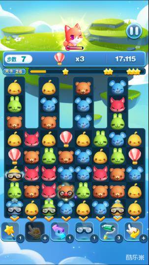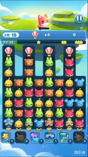 本关卡的主要任务是要收集4个热气球。地图是一个大的正方形,我们可以看到的是在一开始就有四个热气球在最上方,所以棋子基本上都集中在下方的地图里,所以我们只需要集中精力去消除地图下方的棋子就可以了,而且这张地图的棋子分布的非常密集,也是对我们很有利的。