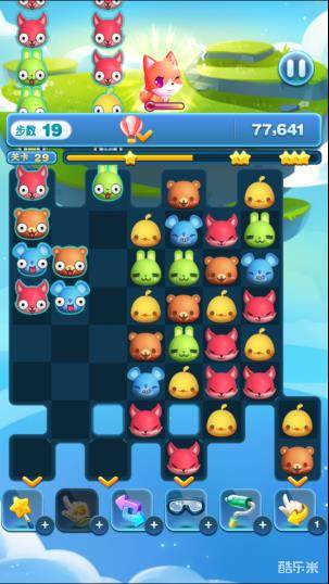 我们在进入关卡后我们可以看到在地图的最右下角有一个旋风小丑和一格目镜射线这是送给我们的,所以我们要好好珍惜使用,两个一起使用是可以直接消除三排的,所以我们需要先让所有的热气球都移动到地图我们能移动的最下方,就能达到一次全部收集齐的目的。我们在进入关卡时会发现一开始时只有一个热气球出现在地图上,这也是给我们造成难点的地方。
