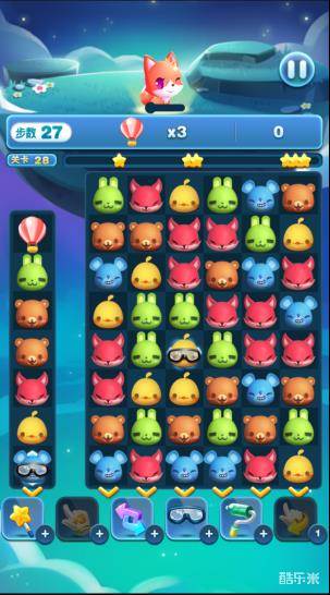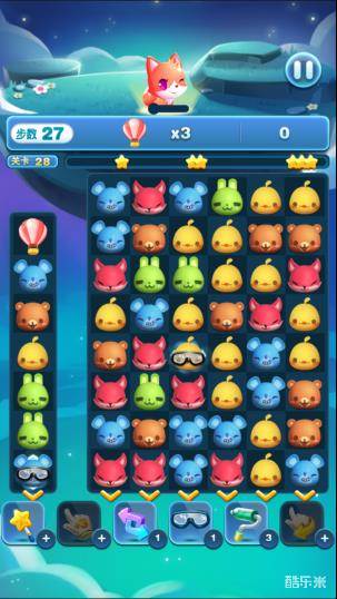 此关的主要任务就是要收集齐3个热气球,我们可以看到地图形状是一个长方形加一列小长条,小长条里面有1个热气球,另外的长方形里面并没有热气球,在消除一定数量的棋子后便会出现另外2个热气球。在长方形这种棋子密集的地图里我们还是很有利的。