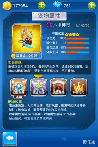 ①六甲神将:拥有技能“玄金剑魄”可使主机攻击力增加24%。每6秒产生剑气,造成85000伤害,敌机有50%概率流血,对流血状态敌人伤害提高30%。这个技能又直接增加了攻击力,又有额外的持续伤害,打BOSS很有优势。