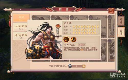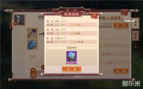 不同武将的各项属性成长率不同,若不满意,可使用“武将洗髓经”对武将进行洗练,改变武将属性成长率,从而改变对应属性值。