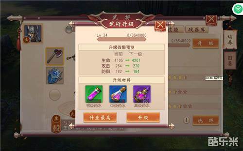 使用武将经验药水可以提升武将等级,升级后会增加武将属性,但是武将等级不能超过主角等级。