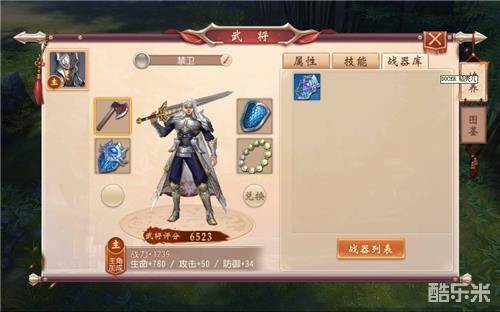 武将有特定武将战器,给武将装备战器,可以提升武将的三项基本属性,并提升武将伤害强度和伤害加成、伤害减免效果,从而使其在战斗及竞技场中的战力提升。数个低阶战器有一定几率合成高阶战器。