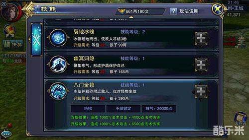 裂地冰魄:该技能的效果为冰锥破地而出,使敌人定身3秒。造成法术伤害,冷却时间30S。