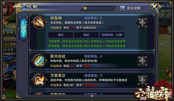 弑鬼神技能效果:四次攻击共造成400%的法术攻击附加额外法术伤害(根据技能等级提升);冷却时间为0.8秒。这是苍龙职业的最基本攻击技能,所以没有技能分支,溅射效果非常的好用,击杀怪物时,可以让苍龙的每一下攻击都是群攻。