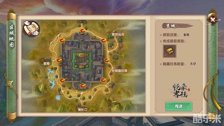 京城的探索任务比较好懂,它是以八卦阵的形式展现出来的,分别在城墙的八个方向,位置非常正所以很好找。而这里使用八卦阵来表现,也正说明了京城的重要性,被八卦阵这种大阵守护,想必这里的妖怪也一定很厉害。这里要注意四个正方向的探索任务,都在城门的上,而完成任务的地方,则在城门的背面,若是点自动寻路,飞行会自动从上方绕行,便会显示你绕不过去,可别因此放弃啊,因为它在与你探索任务同样高度的另一侧。