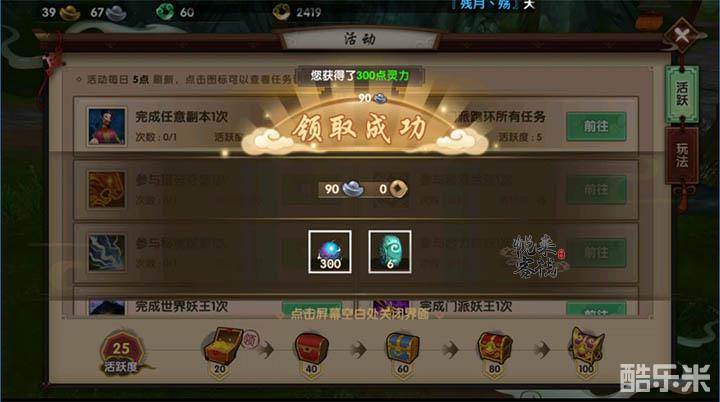 20活跃度奖励为:90银+300灵力+6个一级强化石