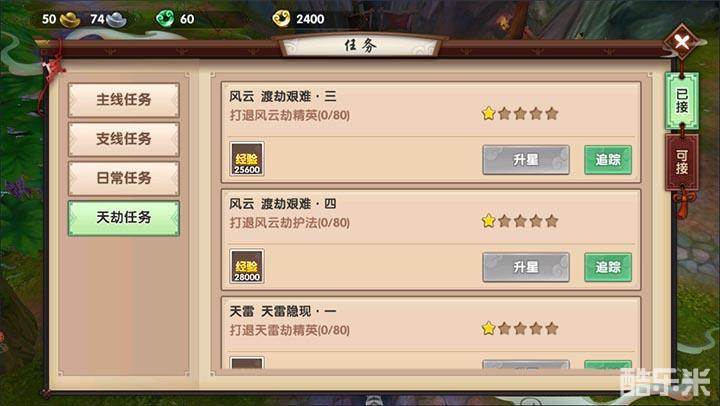 主线任务是最容易获取经验并且非常容易完成的任务,没到达一定的等级就会开启新的主线任务,而相对的主线任务并不会让仙友直接提升至下一个任务等级,所以仙友们在完成主线任务后,就需要通过各种玩法来获取中间相差的经验。日常任务则是通过狩猎野外精英怪来达成,任务会在每天早晨刷新,完成这些任务也可以为仙友带来不错的经验奖励。拾荒任务则是通过拾荒玩法来获取经验值,每个拾荒任务也会根据仙友等级提升而变更,能够获得的经验值也不算少,只不过需要消耗大量的灵力值作为代价。而天劫任务则是在风云劫境或天雷劫境与怪物战斗来完成了,每个劫境任务分为四个阶段,阶段越高怪物越强,而获取的经验也会更多,若是完成了天劫任务先不要着急点击完成,先用金钱将任务升至五星再点击完成,便可以获得最大额度的经验奖励。