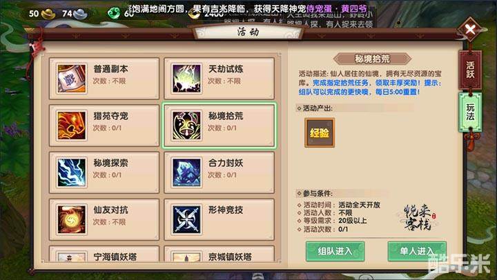 活动玩法中的“秘境拾荒”可以为仙友带来巨额的经验奖励。只需要根据玩法提示在活动中完成三次拾荒任务即可,每次完成便会给予大量经验奖励,若是组队进入,还能共享队友拾荒得到的活动道具,从而使活动时间大大缩短。所以推荐组上一队仙友一起去拾荒才好。