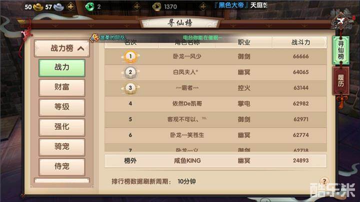 等级:顾名思义,当然是最高等级排行榜了,等级相同的仙友将会根据经验值高低来排名。