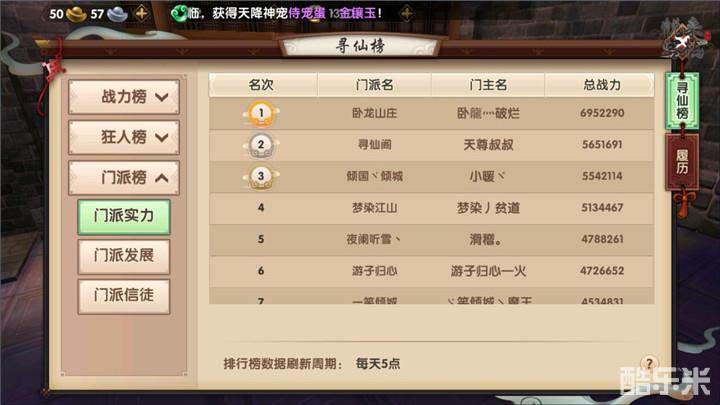 门派实力:记录门派全体仙友的“历史最高战力总和”的榜单。当然门派内的高战力越多自然是越好的。