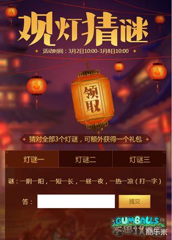 在此元宵佳节,冈布奥委员会本着益智动脑的原则,为冒险者们设计了不少的烧脑灯谜,有这样的“刘邦笑,刘备哭”,还有这样的“一阴一阳,一短一长,一昼一夜,一热一凉”。每位冒险者需要答对所获题库的3道灯谜,才能够获得对应的3条密令奖励,同时答对全部3条灯谜后,还可额外领取一个礼包码。3月2日至3月8日,一次来自冈布奥的灯谜考验,各位正式服的冒险者准备好应战吧!