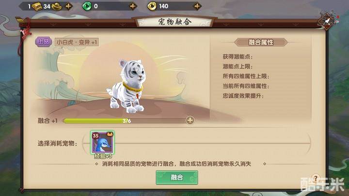 所谓侍宠融合,是指消耗同品质侍宠为指定侍宠提升星级【三星为满星级】,继而提升该宠物四维、潜能的玩法。侍宠融合可以极大提升侍宠的战斗能力。因此不少有条件的仙友都会努力去提升侍宠的融合星级。