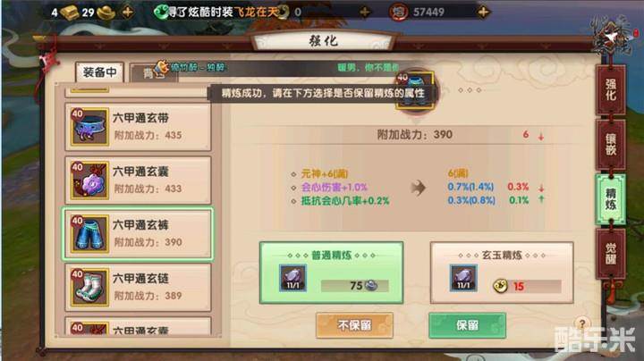 普通精炼需要花费他山之石与银币,而高级精炼则需要消耗他山之石以及一些玄玉,在点击精炼后若是属性不够理想则可以选择不保留,反之选择保留即可留住你想要的属性。并且每次精炼可不是都在提升属性哦,通过精炼使属性减少的例子也是很经常见到的。不过若是洗出单属性满的属性,无论其他属性有多低都推荐选择保留,因为一个满的属性,就会让你这个属性完全固定在这件装备上,非常的划算。