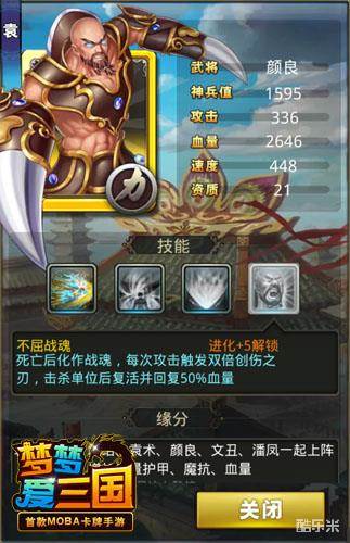 颜良是袁绍最得力的战将之一,为袁绍一统北方立下汗马功劳,在袁氏阵营的金卡武将中,颜良依旧彰显猛将本色,伤害能力不俗,尤其在攻击血量较少的地方武将时,还有高额的伤害加成;大招“不屈战魂”能让他在死亡后继续暴力进攻,击杀地方单位还能复活自己。