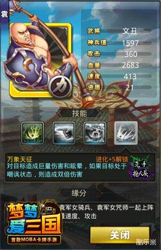 文丑不愧为沙场的杀神,成为首批《梦梦爱三国》袁氏阵营的金卡武将之后,不仅有控制有伤害,而且每次进攻和击杀地方单位,自身都会获得不错的攻击和防御加成,真实越杀越勇;具备先手能力的大招“万象天征”拥有成吨的伤害,是不错的抢人头技能。