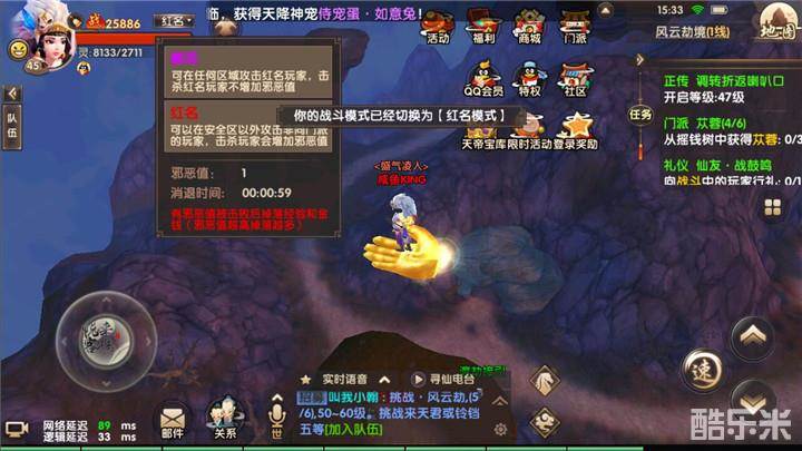 善恶状态的切换就在战力值的右边,他一共分为三个状态,“和平”“善恶”“红名”。和平状态是无法攻击他人也无法被攻击的,是处在安全区中状态。善恶状态是可以在任何区域内攻击红名玩家,并且击杀红名玩家时不会增加善恶值。而红名状态,则是可以在安全区以外的地区攻击非同门派的玩家,击杀玩家后会增加自己的邪恶值。自身的邪恶值会在善恶面板中显示,并且会显示其善恶值消退的倒计时,到倒计时结束前,红名玩家都无法切换为其他状态。而在切换为红名的瞬间,会增加一点善恶值,消退时间为一分钟。