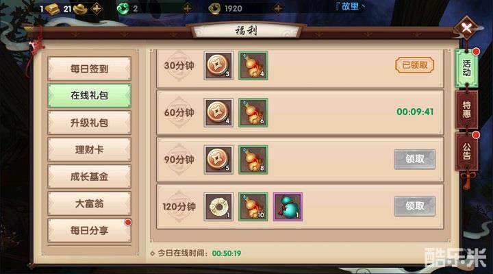 福利系统当中也可以获得大量玄玉奖励,比如理财卡和成长基金两种,均能够获得大量的玄玉奖励。另外每日在线120分钟的礼包中也会赠与玄玉奖励,而在大富翁抽奖时,也有机会抽到玄玉以及道具奖励。