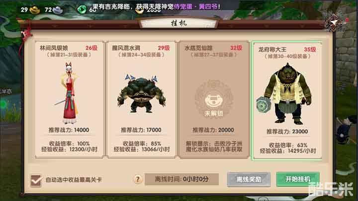 我们在进入之前,最好也勾选上“自动选中收益最高关卡”这样每当我们离线之后,便会自动在这里挂机哦,并且就算在线,但却没有操作,也会在十分钟之后进入“神游”状态,从而进入离线挂机中。