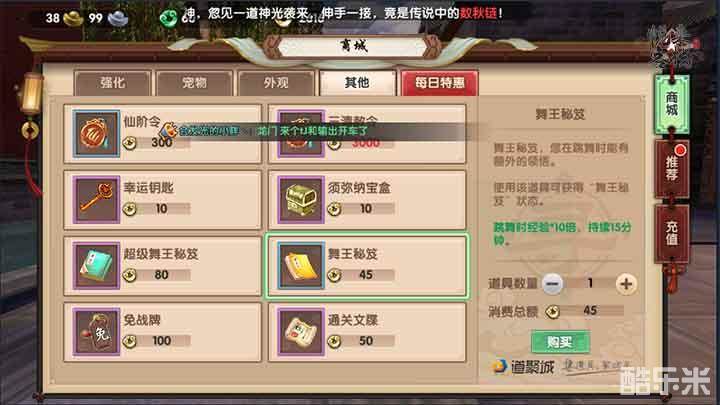 在线挂机通常选择在宁海县城挂机跳舞,挂机跳舞并使用“舞王秘籍”等道具后,将会进入多倍挂机经验状态,在这个状态下挂机获得的经验量非常惊人,可以用以快速提升仙友们的等级。