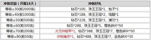 活动内容:玩家等级达到30、40、50、60、70、80级都将获得官方准备的精美冲级好礼,包括橙色、紫色装备,碎片、钻石及后宫道具!