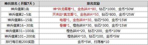 活动内容:活动期间内,神兵排行榜排名达到以下要求将会获得对应的奖励: