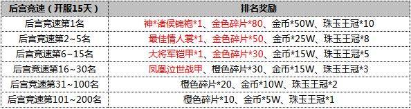 活动内容:活动期间内,后宫竞速关卡数通关最高的玩家为第一名,若玩家在活动期间内都达到最高关卡,则按时间先后取第一个。活动结束后将会获得对应的奖励: