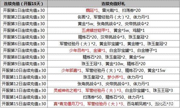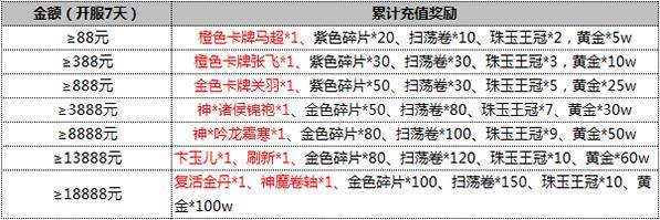 活动内容:活动期间内,每日累计充值只要满足以下条件,都可以获得相应的奖励,连续7天充值可额外获得金猪一只,连续15天充值可额外获得橙色武器斗神震天戟一把!: